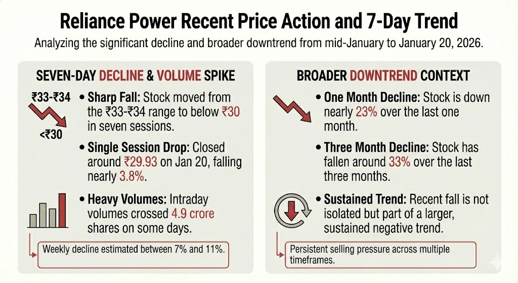 Over the last seven trading sessions from mid January to January 20, 2026, Reliance Power has moved from the ₹33 to ₹34 range to below ₹30. The stock closed around ₹29.93 on January 20 after falling nearly 3.8 percent in a single session. Intraday prices have ranged between ₹29.75 and ₹31.37 with heavy volumes crossing 4.9 crore shares on some days.